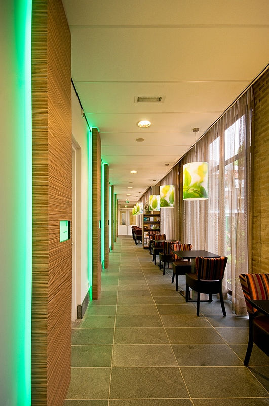 In plaats van een traditionele wachtkamer is gekozen voor een “wachtgang” met uitzicht op de binnentuin. Het daglicht, het groen en de rustige inrichting zorgen voor ontspanning en dragen bij aan een prettige wachtruimte-ervaring.