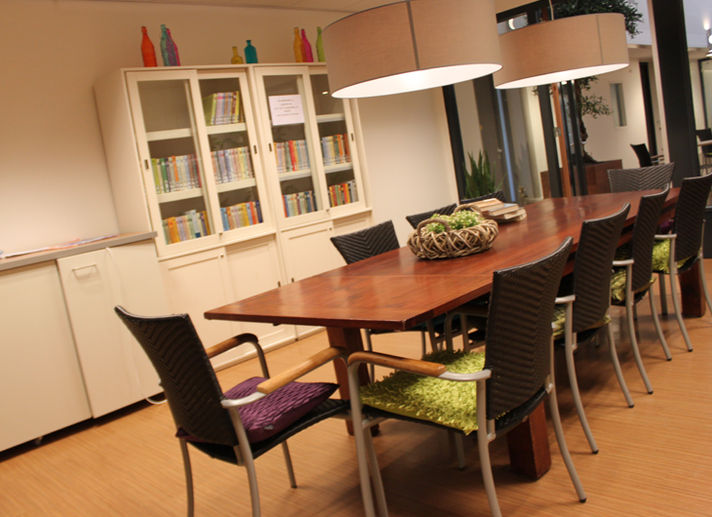 De inrichting is bewust neutraal en warm gehouden, met rustige kleuren en natuurlijke materialen die in beide functies tot hun recht komen. Door een doordachte indeling en flexibel meubilair ontstaat een open en uitnodigende omgeving die gemakkelijk te herinrichten is, zonder dat de sfeer verloren gaat.
